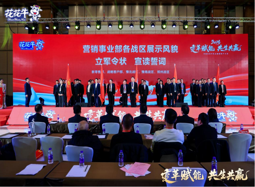歲末寒冬,暖意融融,河南花花牛乳業(yè)集團2026年度客戶大會盛大召開,集團領導班子,核心經(jīng)銷商、配送商伙伴,外部行業(yè)專家,營銷事業(yè)部戰(zhàn)區(qū)負責人、業(yè)務代表及相關部門人員等430余人齊聚一堂,共商發(fā)展大計。會議系統(tǒng)回顧了2025年度河南花花牛乳業(yè)集團的經(jīng)營發(fā)展成果,對2026年的發(fā)展戰(zhàn)略進行了前瞻規(guī)劃與周密部署,為集團邁向更高質(zhì)量發(fā)展奠定了堅實根基。會議還重磅發(fā)布輕覺五紅酸奶、“5+5”輕食瓶酸奶等戰(zhàn)略新品,以及利樂鉆草莓牛奶、“嗨!檸好”、煥新版“暢極多”等多種年度新品,以創(chuàng)新產(chǎn)品矩陣開啟2026年度發(fā)展新篇章。